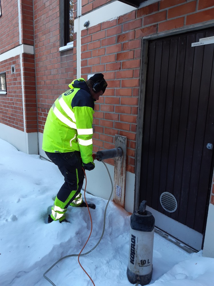 Poraamme lattioihin ja seiniin reiät LVI- tai sähköjohdoille.
